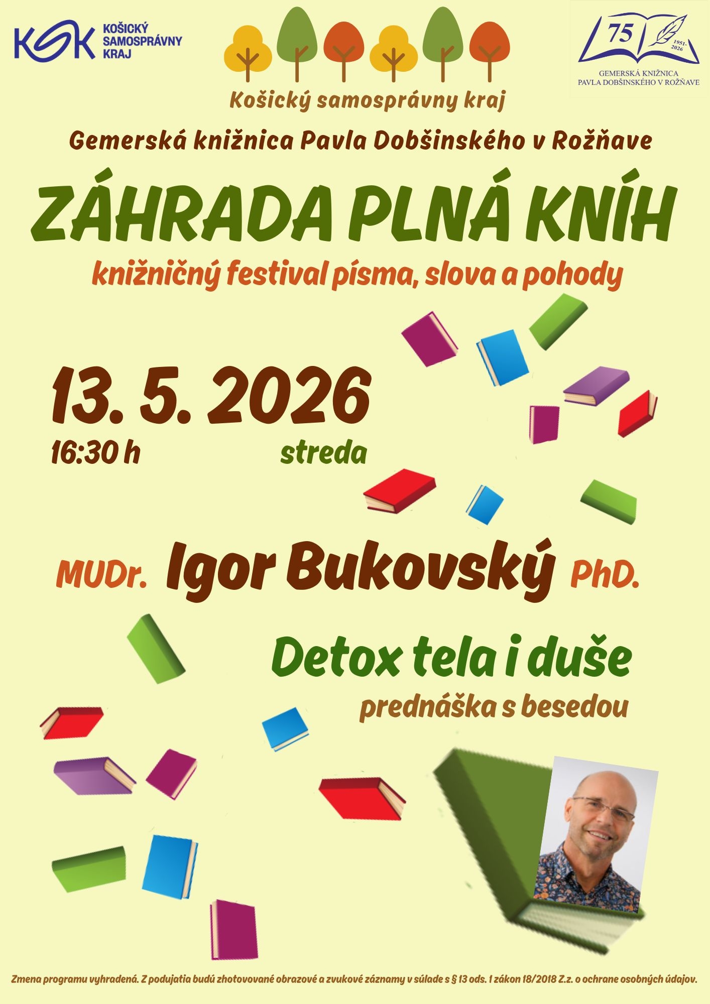 Gemerská knižnica Pavla Dobšinského v Rožňave pozýva na prednášku s besedou Detox tela i duše - MUDr. Igor Bukovský PhD., ktorá sa uskutoční 13.5.2026 o 16:30 h. v rámci knižničného festivalu písma, slova a pohody - Záhrada plná kníh.