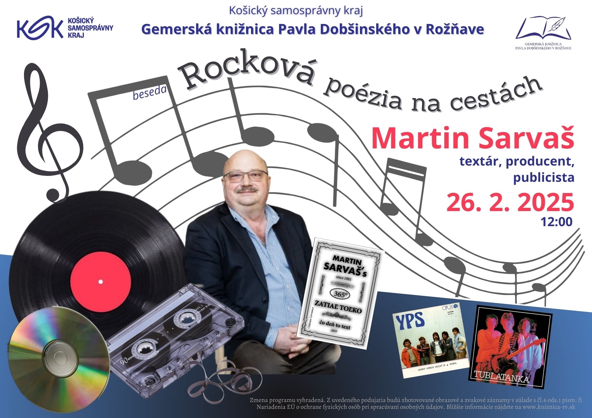 Gemerská knižnica Pavla Dobšinského v Rožňave pozýva na besedu s textárom, producentom, publicistom - Martinom Sarvašom - Rocková poézia na cestách.